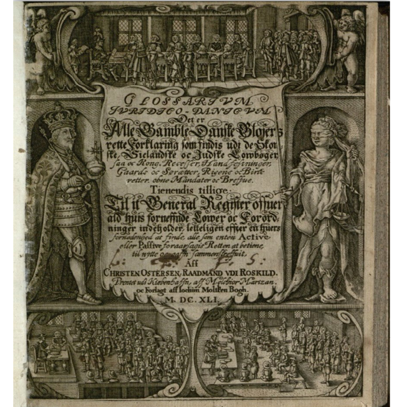 Titelblad fra værket "Glossarium juridico-danicum, det er alle gamble danske Glosers rette Forklaring, som findis udi de skonske, sielandske oc judske Lowbøger ...”. Værket blev udsendt af kong Christian IV i 1641, og titelbladet viser de tre retsinstanser: herredstinget (nederst til højre), landstinget (nederst til venstre) og kongens retterting (øverst). Selv er Christian IV afbilledet til venstre over for retfærdighedens gudinde, Justitia. Foto: ukendt.